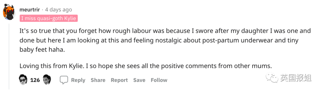 “的确,人会忘记生娃有多难,因为我当时生完女儿就已经要死不活了,但现在看着凯莉的产后内裤和婴儿的小脚丫,竟然产生了‘怀旧感’哈哈。