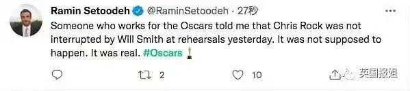 史皇冲上去打完人又飞速回到了观众席,整个过程很快,来不及闪。被暴击的Chris Rock懵了一下,竟然马上贱兮兮讲起段子:“哇哦,史皇刚才狠狠打了我一顿呢”。回到座位后的史皇超大声与Chris在奥斯卡颁奖典礼现场对骂。