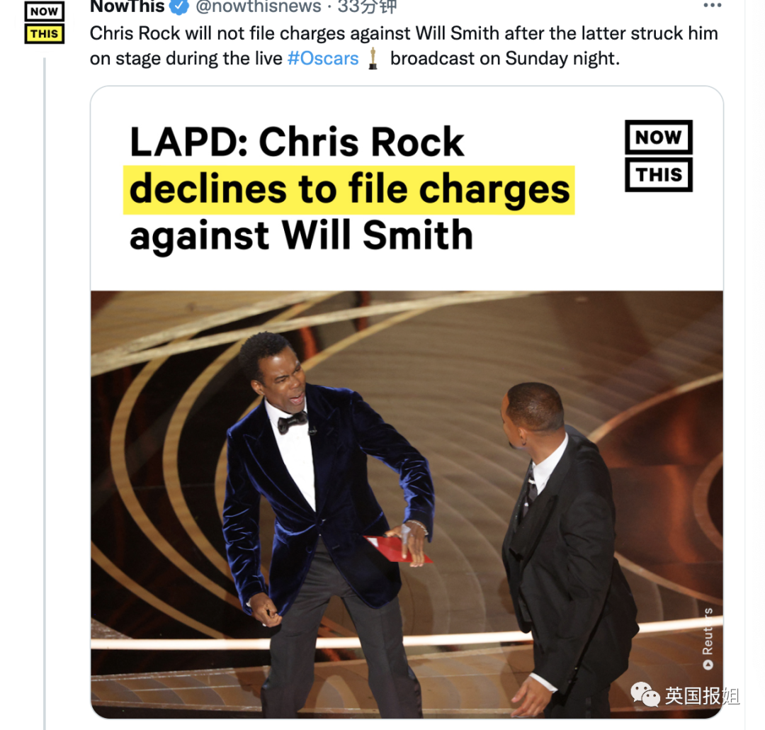 在打人事件后,双方的公关公司都紧急联系了对方。Rock最后宣布,他不会起诉史皇。Rock得到了流量和关注,又做出一副“宽宏大量”的样子,让人忽略他无耻的笑话。所以说Chris Rock这人精得很。