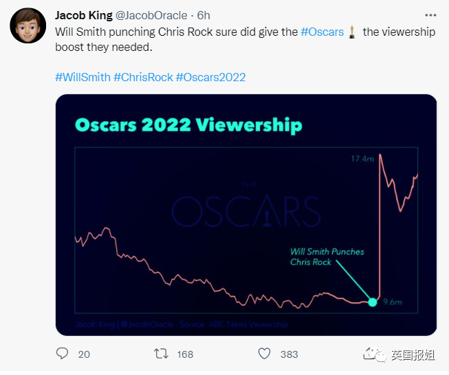 史皇这一巴掌打出来780万观众,把收视低迷的奥斯卡打上热搜,以一己之力盘活了欧美娱乐圈。