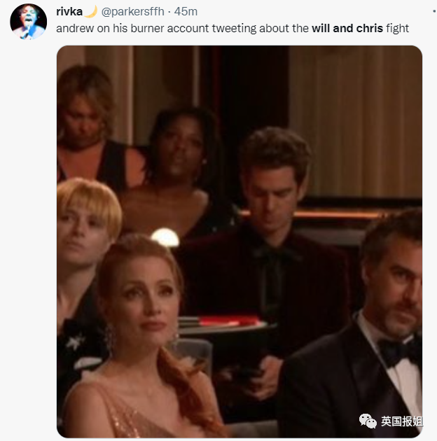 有人恶搞了其他在场明星的反应:“加菲正在疯狂发推直播Chris和史皇大战”