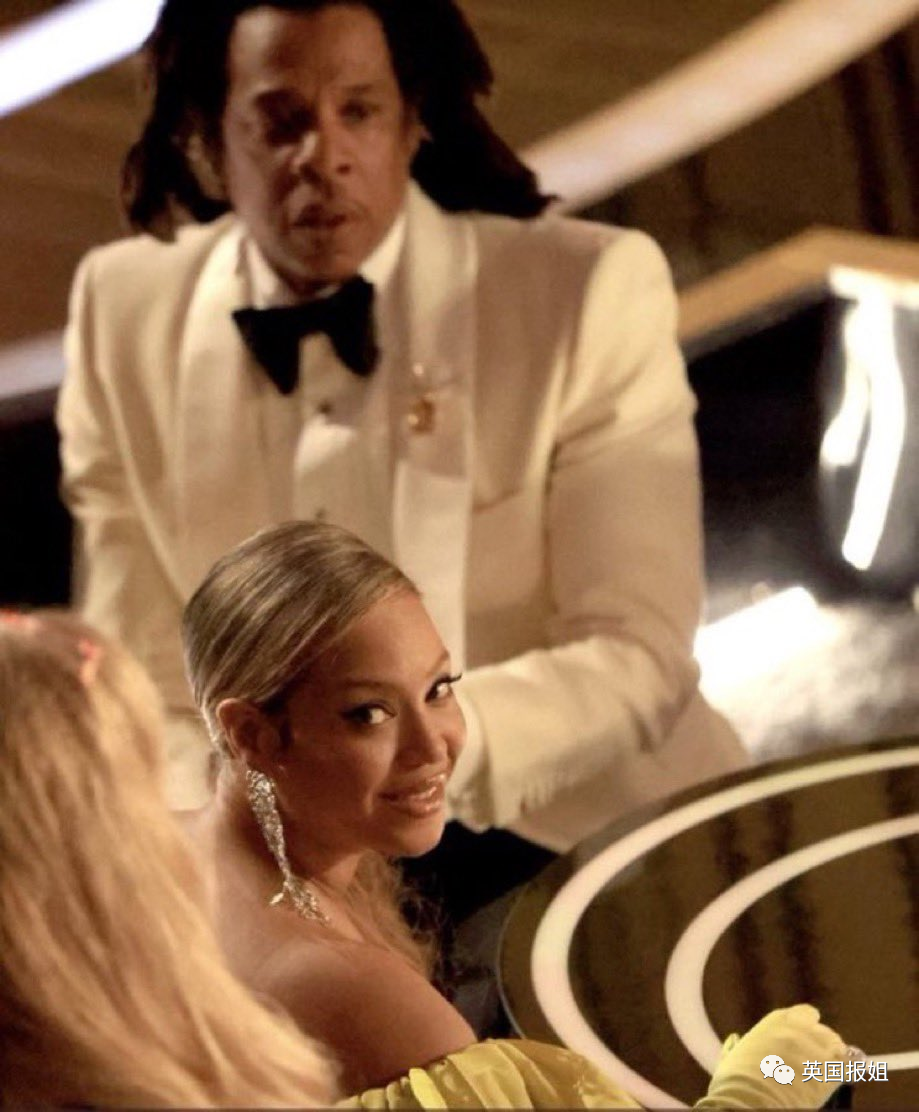 在打人现场的碧局长看到混乱的场面开心一笑,而身后的丈夫Jay-z则面露惊慌。相信他也想起了当年自己被小姨子在电梯里暴打的惨痛回忆: