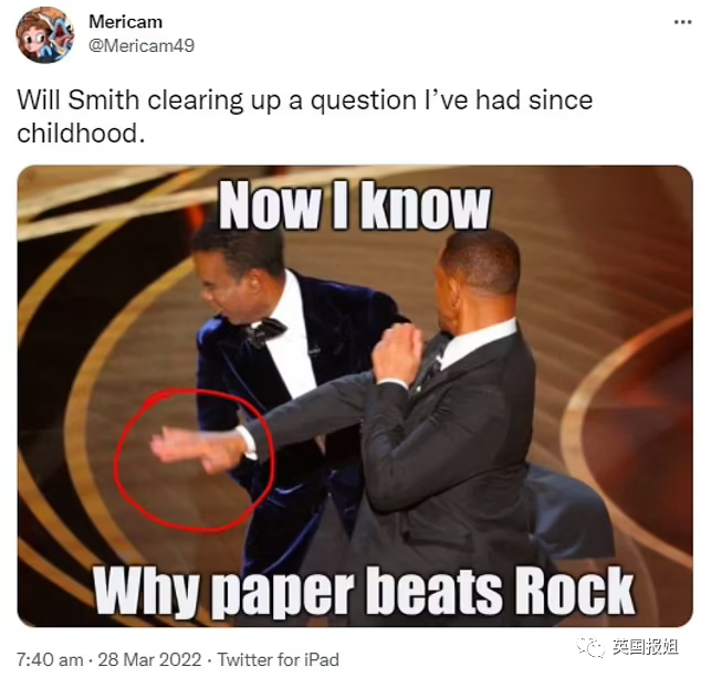 还有一些扣钱的谐音梗:“史皇暴打Chris Rock解开了我的童年谜题——为啥石头剪刀布的布可以打败石头(rock)。”