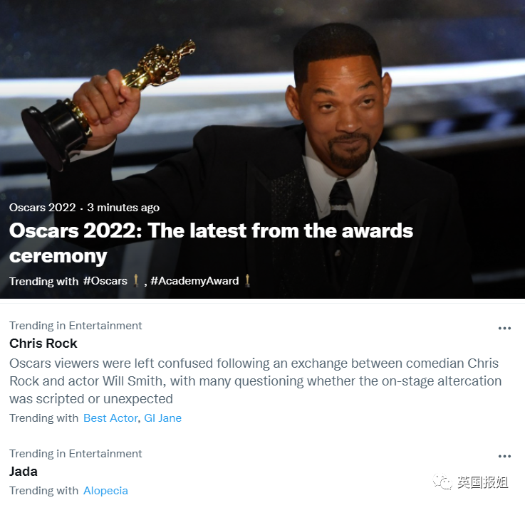 推特热搜被史皇、Jada和Chris Rock的名字占满。