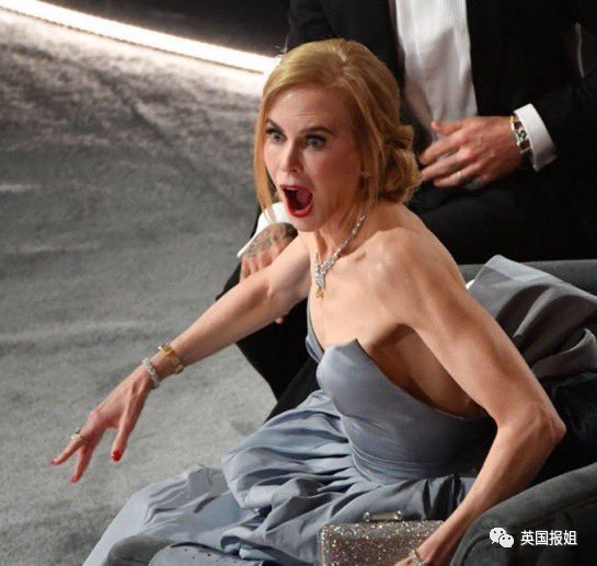 当场嘉宾既尴尬又惊讶,想看戏又必须装出严肃的样子真的很好笑。比如前排看戏的妮可·基德曼,吓得眉毛都展开了: