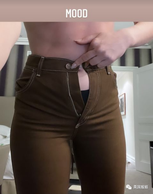 随后,结石姐又发了一张表达心情的图,看似是扣不上扣子的牛仔裤,实则重点在竖起的中指。