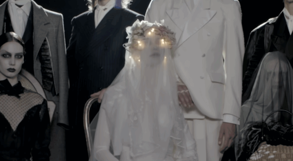 新娘来了,她手提裙摆款款踱步,可无论如何精致优雅,都抵不掉扑面而来的神秘诡谲之感。