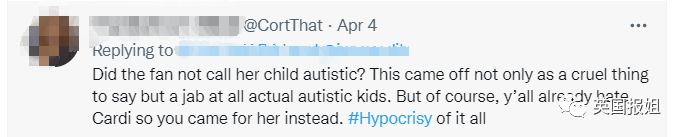 众所周知,现在欧美的网友最喜欢的就是挑刺。明明是粉丝先用自闭症造谣卡老师的儿子,却有网友说卡老师把自闭症当成一种骂人的词汇,是在歧视自闭症: