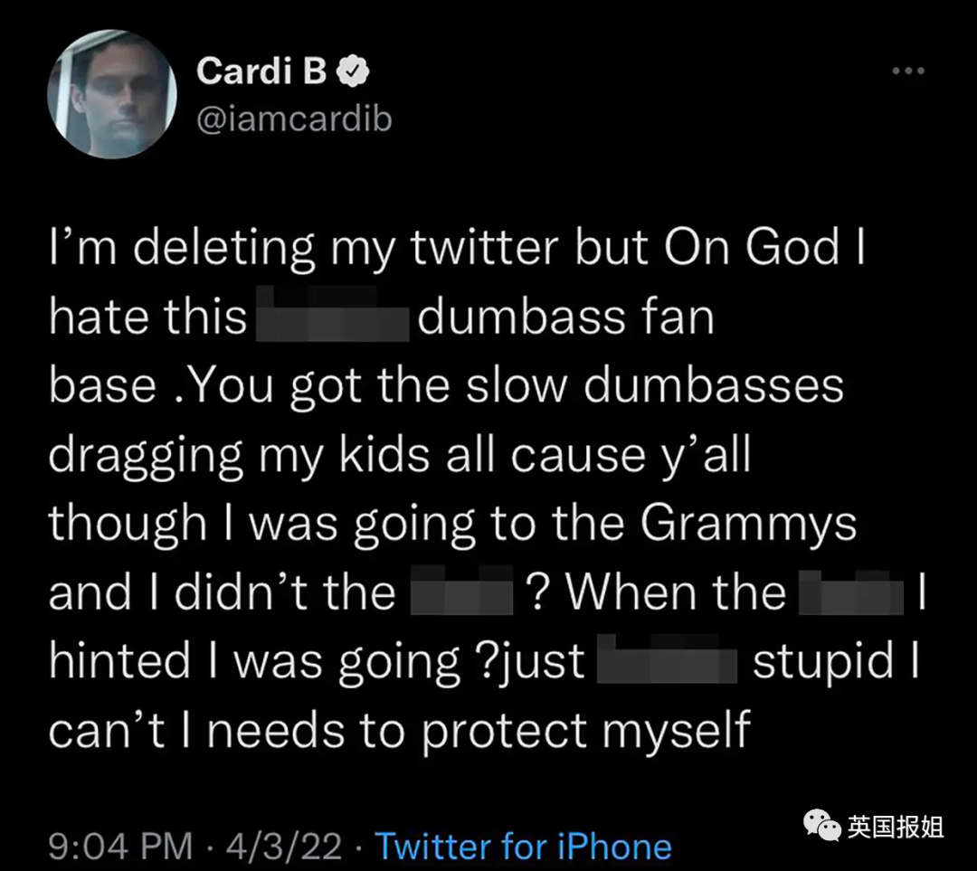 你们非要骂我的孩子,就是因为我没有去那个XX格莱美?我有暗示过我会去吗?实在太XX傻X了,我不能再继续跟你们吵了,我要自我保护。”