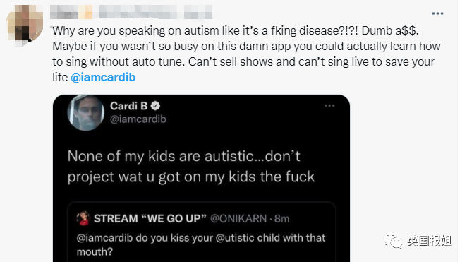“你这个蠢驴为什么要这么说自闭症,也许你该用你成天忙着刷推特的时间学学怎么不用自动调音器唱歌,演唱会卖不出去,现场唱不好救不了你的职业生涯。”