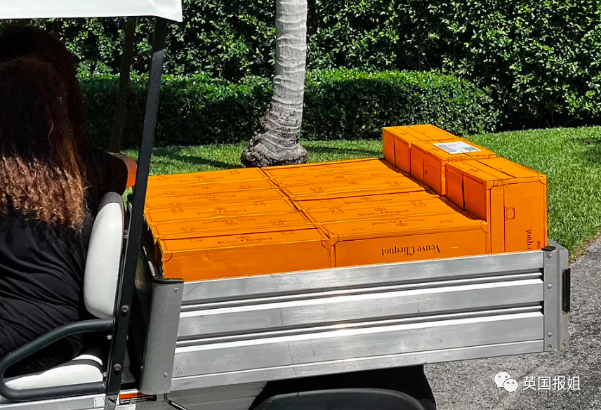 媒体拍到了工作人员在晚宴开始前,开着高尔夫车成箱成箱运送香槟的照片。查了下牌子,是法国香槟品牌凯歌,一瓶要625人民币左右。除此之外还有若干瓶1660人民币/瓶的法国堡林爵香槟。