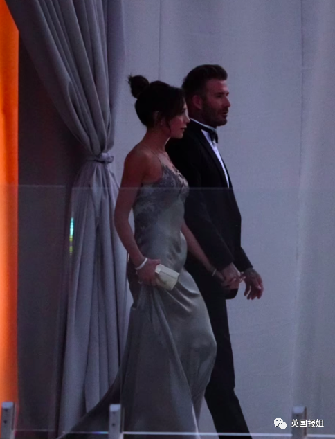妈妈维多利亚的着装选择很有个性,选了一条自己设计的亮银色吊带裙。