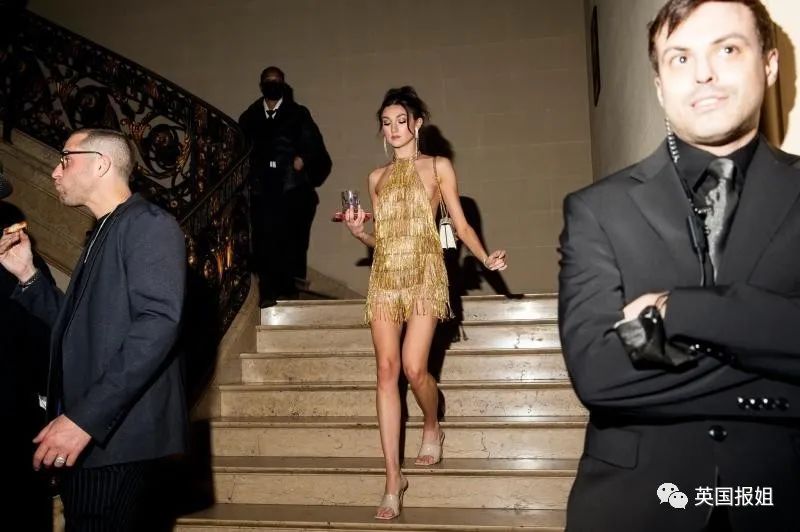 模特Sara Sampaio的金色亮片长裙华贵优雅,