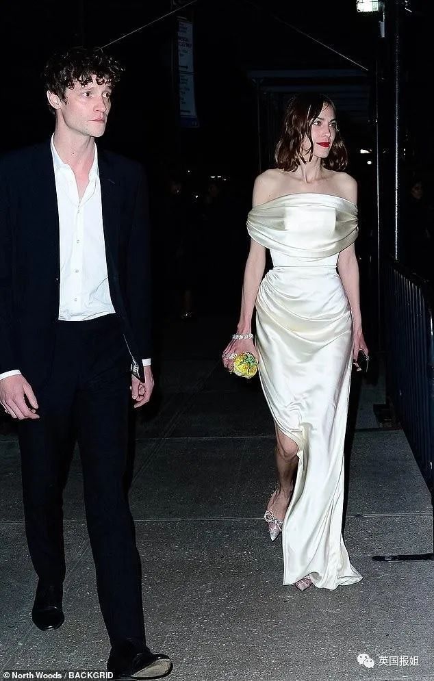 缎面白裙真的很显气质,Alexa Chung这一身没有凯莉的那么性感,但她高挑纤细的身材,让这身造型更优雅了。