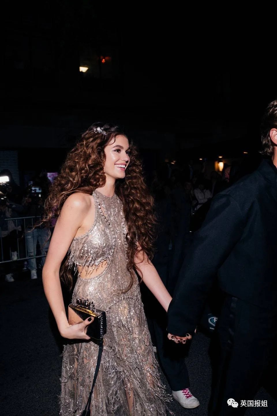 超模Kaia Gerber没重新换衣服参加派对,而是穿着红毯上的银色亮片羽毛礼服。