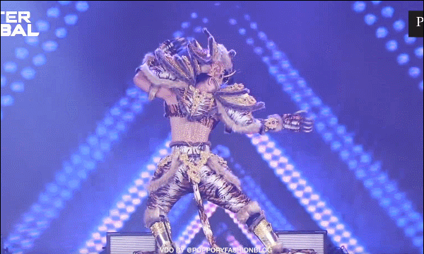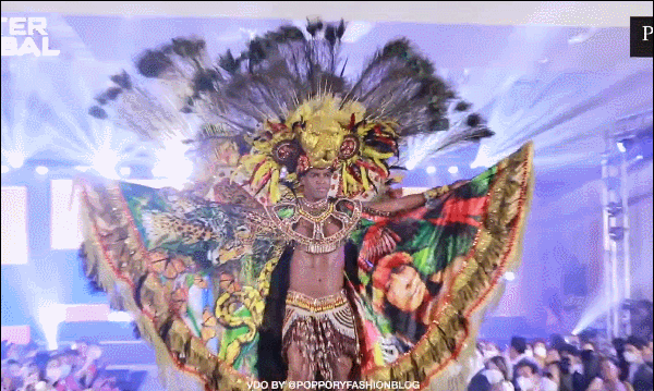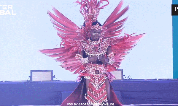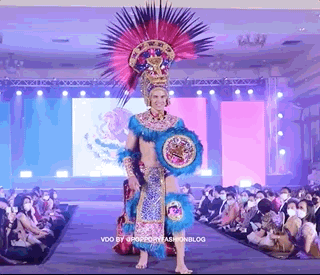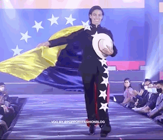 这套民族服装用了委内瑞拉国旗的三个颜色,然后把国旗上的星星铺到了自己身上。