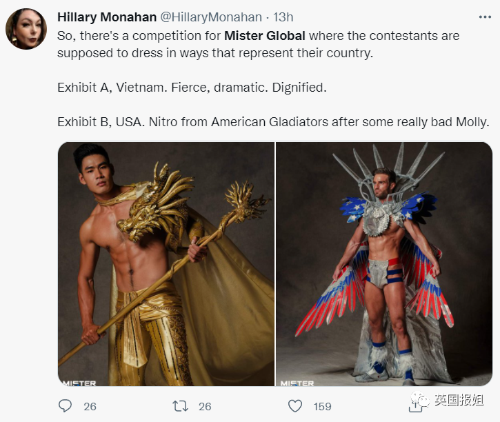 “环球先生的比赛中,参赛者应该穿着代表他们国家的服装。