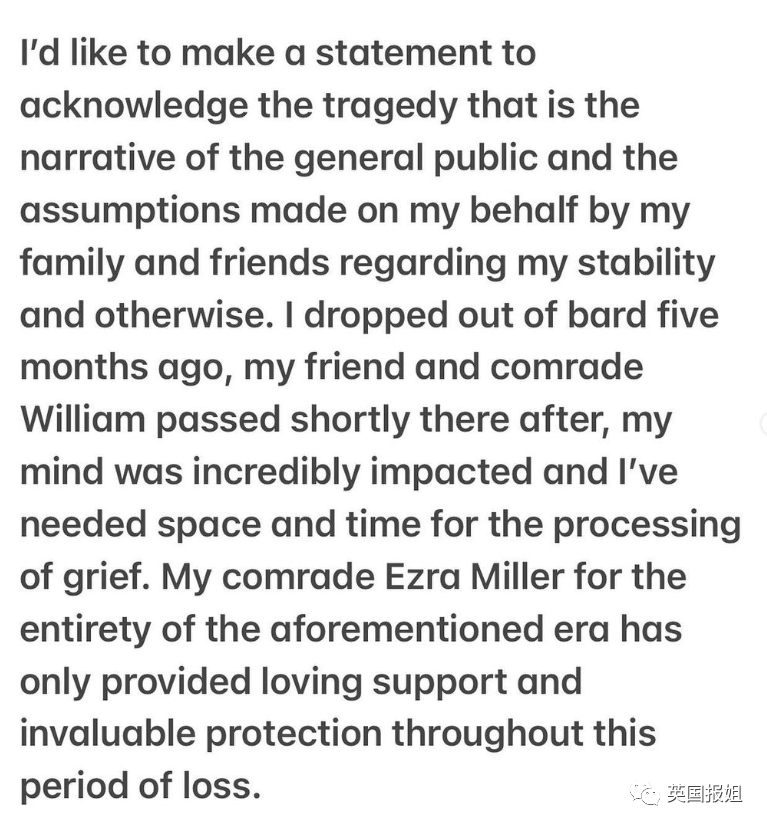我退学是因为我的朋友威廉在那段时间里去世了,我的思想受到了极大冲击,我需要空间和时间来处理悲伤。”