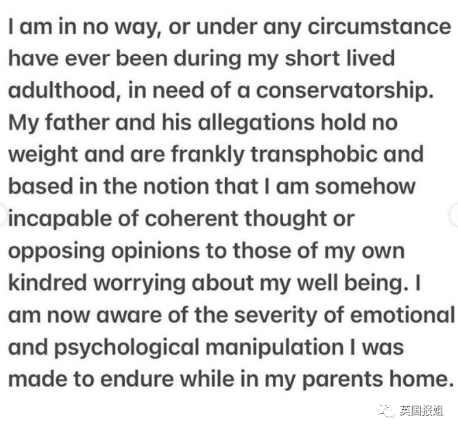 我的父亲的指控没有任何意义,他是因为恐跨和自认为我没有判断能力。我现在意识到我在父母家中,才受到了严重的情绪和心理操纵。”