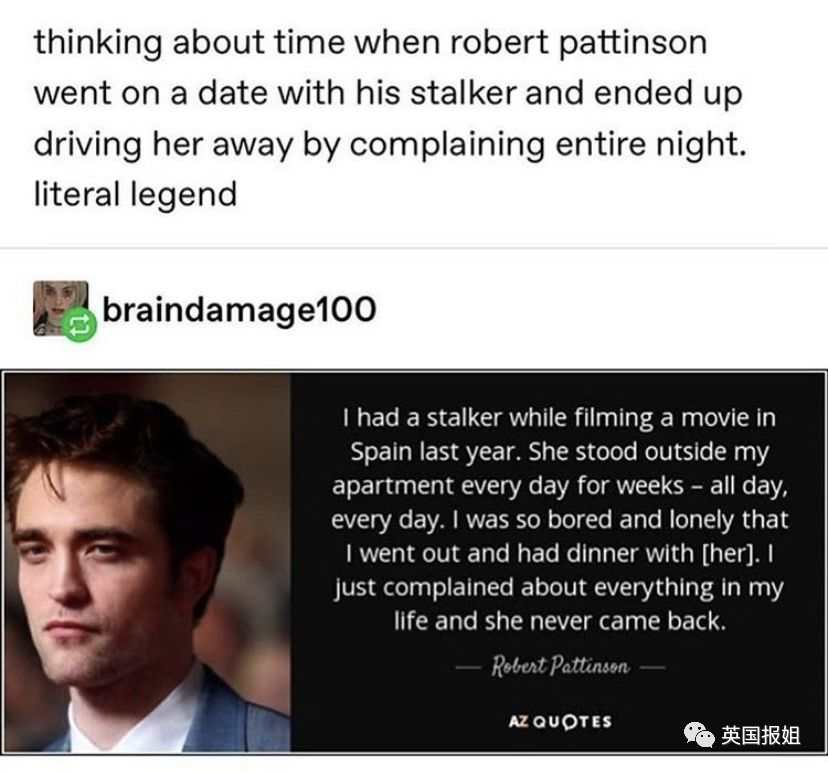 罗伯特曾在西班牙拍片时被私生饭跟踪。有一天,罗伯特无聊就请对方吃了顿饭,全程各种抱怨生活大吐苦水,啰嗦了两个小时。
