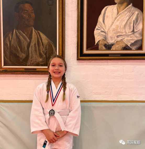 小七拿到柔道比赛奖牌时给女儿拍的照片,
