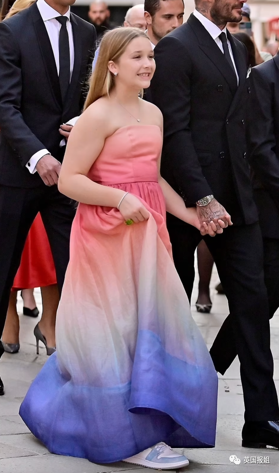 身高已经到爸爸肩部,留着一头长发的她,戴着秀气的钻石耳钉和项链,身着澳洲服装品牌Zimmermann价值13200人民币的粉紫渐变色长礼裙,脚蹬价值4800人民币的Air Jordan 1 Retro High OG Hyper Royal球鞋出场。