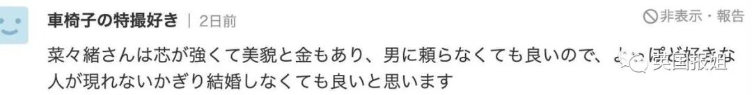 “菜菜绪的内心很坚强,有美貌有金钱,不依赖男人也可以,所以只要没有特别喜欢的人出现,那就不用结婚。”