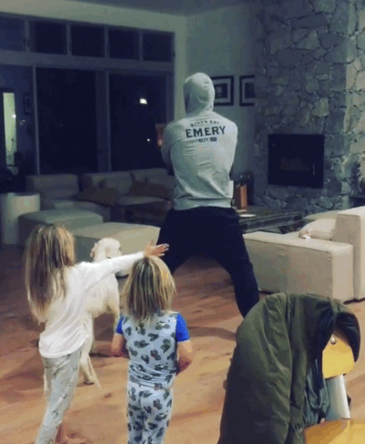 还超级知道娃喜欢啥,熟练地把娃举高高……