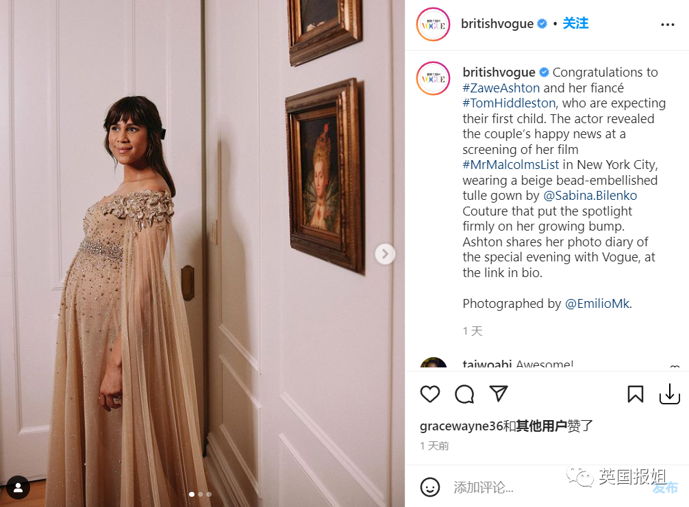 “祝贺Zawe与未婚夫Tom即将迎来他们第一个孩子。”