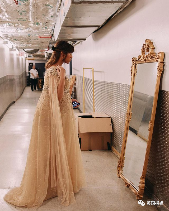 她穿着一身米色薄纱长礼服,缀着星星点点的珠饰与花朵,但最引人注目的还是她隆起的腹部。