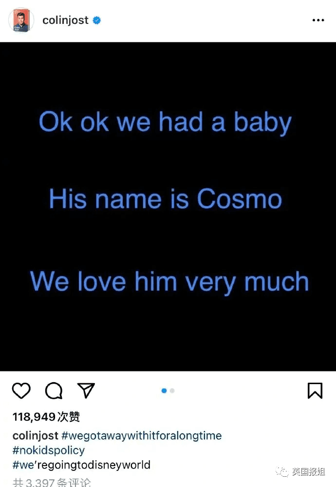去年,她还和现任老公科林·乔斯特有了孩子,名为Cosmo。