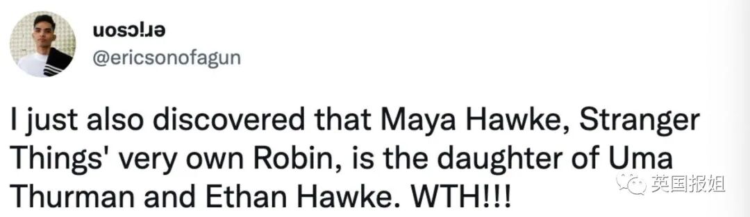 “我刚刚才知道《怪奇物语》里的玛雅霍克是乌玛瑟曼和伊桑霍克的女儿!”