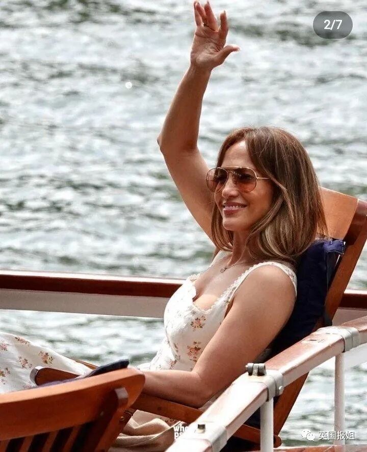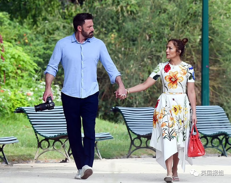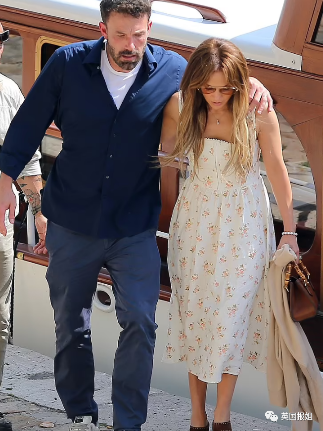 JLo换了一身白色碎花连衣裙,非常清爽迷人,大本则穿了一件海军衬衫和蓝色长裤。