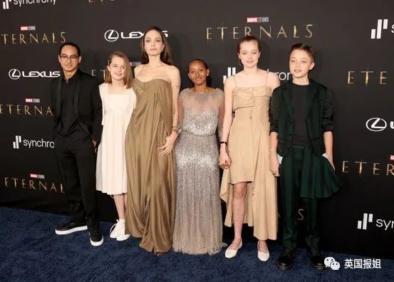 20岁的老大Maddox,17岁的老三扎哈拉,16岁的老四希洛,以及13岁的老幺龙凤胎诺克斯和薇薇安都陪着妈妈走了红毯。