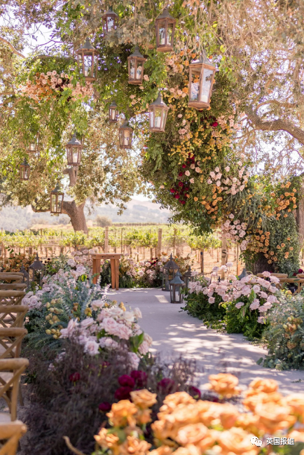 婚礼现场的布置也是这种自然又不失优雅的风格,过道两旁开满了各色花朵。