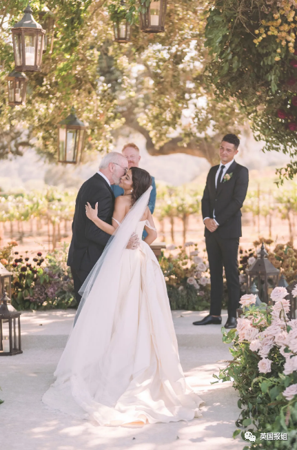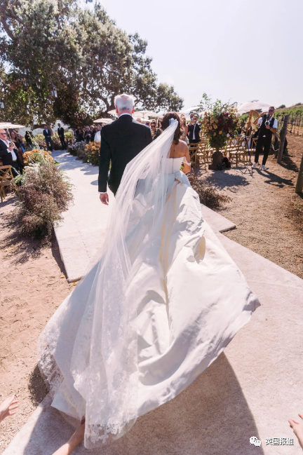 莎拉被父亲牵着走上婚礼过道时,还可以看到周围绿树成荫。