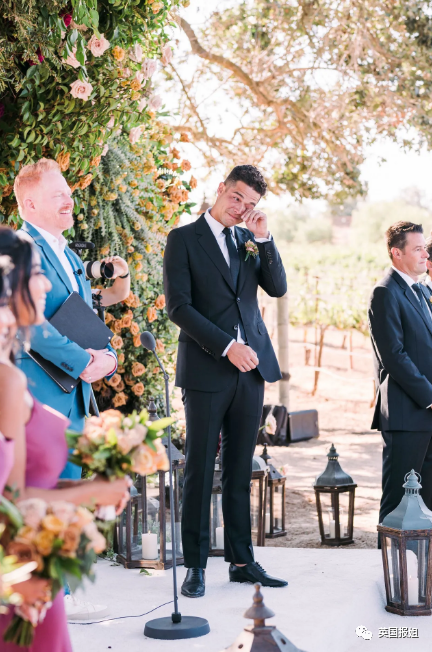 而新郎站在过道的终点,擦着眼泪等着牵过新娘的手。