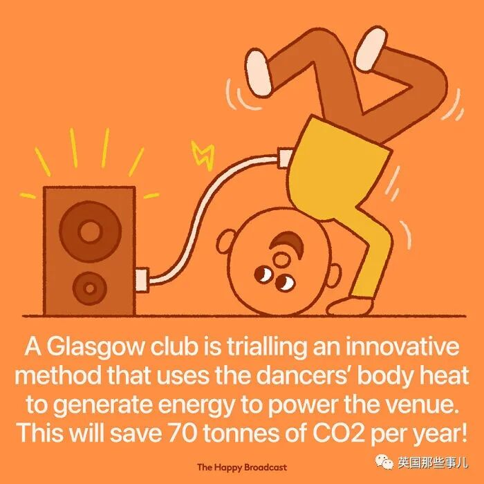 格拉斯哥一家酒吧正在试验一种创新的能量供给方式——将热舞中人们身体的热量转化成供俱乐部使用的电能。这可以在一年中减少70吨的二氧化碳排放。