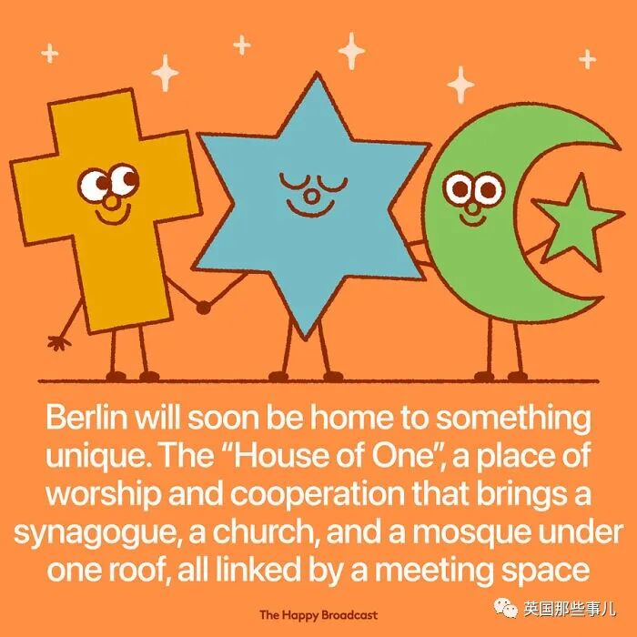 为增进不同宗教信众之间的相互了解,德国柏林将新建一座名为“House of One”的混合教堂,里面有犹太教堂,基督教堂,还有清真寺,三个教堂由一个会见区连接。