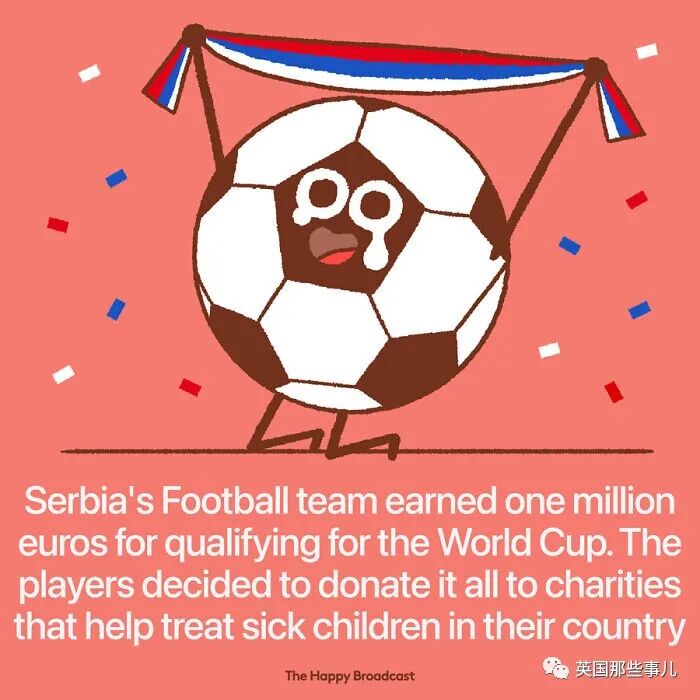 因为成功晋级世界杯,塞尔维亚足球队获得100万欧元的奖励。但球员们最后决定把这笔钱全部捐给帮助救治患病儿童的慈善机构。