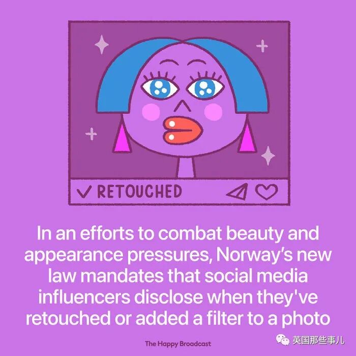 为了打击容貌压力,挪威新法律规定,网红明星的美颜照片都要打上特殊Logo水印,p图、滤镜,全都要标注。