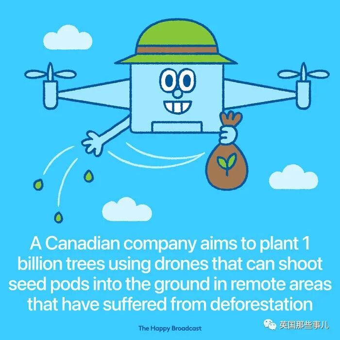 加拿大一家公司计划用无人机播种10亿棵树,无人机将飞到遭受滥砍滥伐的偏远地区,往地上射下种子。