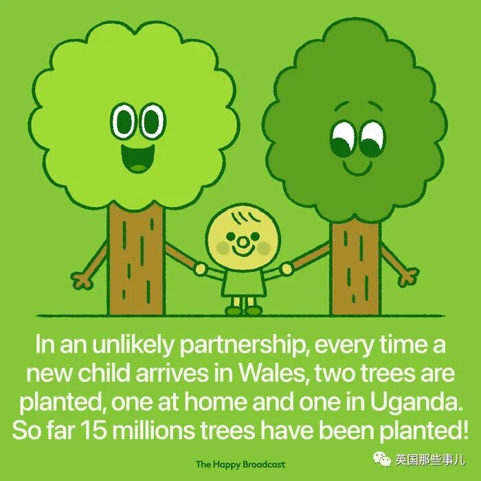 每一次威尔士有一个新生儿出生,他们就会种下两棵树,一棵种在自己家,另一棵种在乌干达,目前已经种了1500万棵树!
