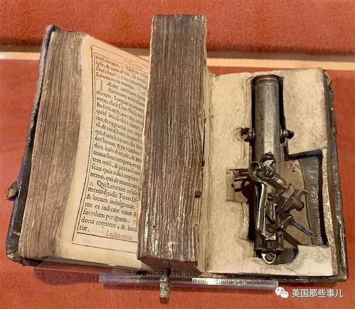 一把藏在圣经里的手枪,1619-1694年间为威尼斯总督Francesco Morozini制作,他不需要打开圣经,只要拉一下丝质书签,手枪就会射击。