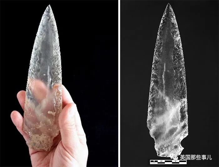 在西班牙一座5000年前的巨石墓中发现的水晶矛头。墓中有25人的遗体,其中有几个人吃了一种有毒物质。
