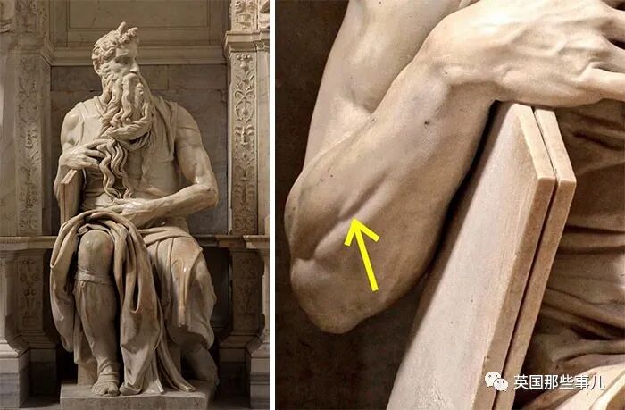 1513-15年,米开朗基罗创作的大理石雕塑摩西像,其中一个最令人惊叹的细节是前臂的小肌肉细节。前臂有一块小肌肉,只有小指抬起时才会凸显出来,雕像中摩西抬着小指,所以这块小肌肉被精准雕刻了出来。
