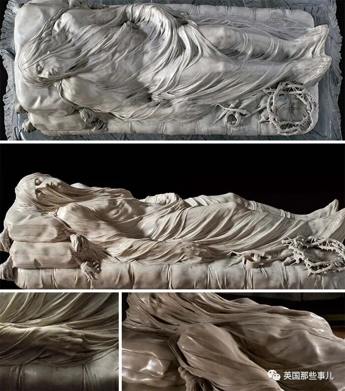 蒙纱的基督,1753年 Giuseppe Sanmartino创作的大理石雕塑,因为细节太过真实,甚至当地还流传着这样一个传说:最早是真的纱覆盖着雕塑,长年累月,经过化学作用,纱布变成了大理石。