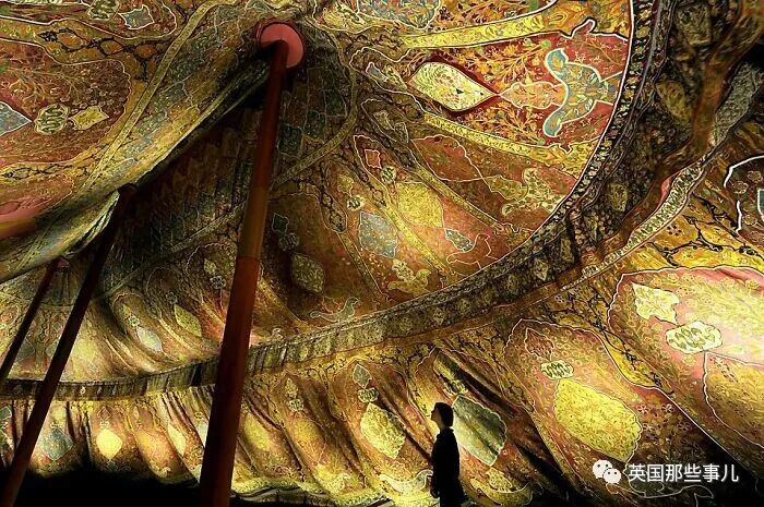 一座17世纪奥斯曼三桅帐篷,由丝绸和镀金皮革制成。