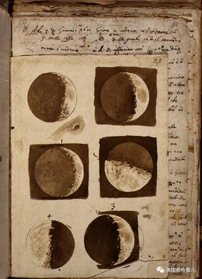 1609年伽利略通过望远镜观察到月球后绘制的有史以来第一张月球图。