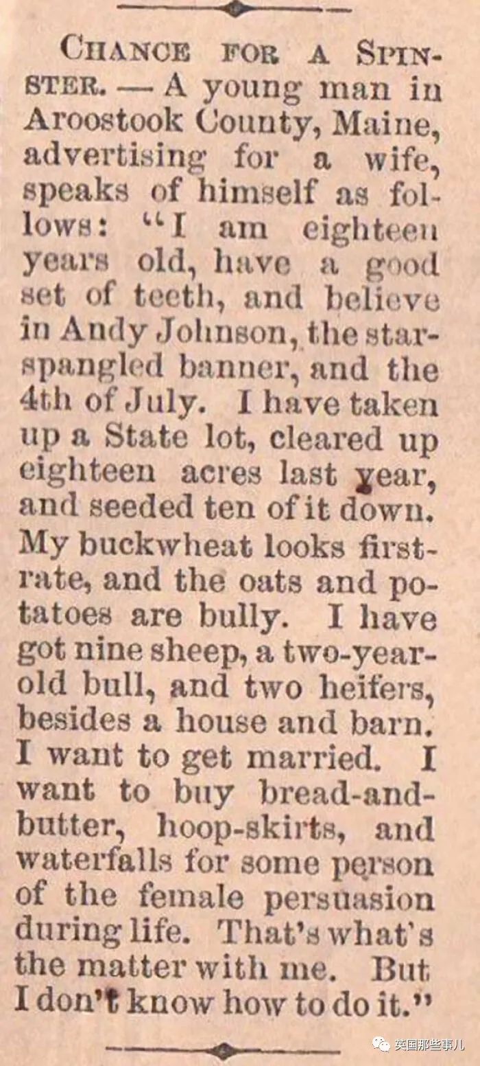 一名来自缅因州阿鲁斯图克县男子广告寻找妻子,他如此描述自己:“我今年18岁,有一副好牙。